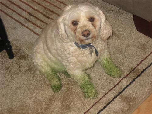 OMG, that is too funny....that's werid, though, my dogs never get green on them....