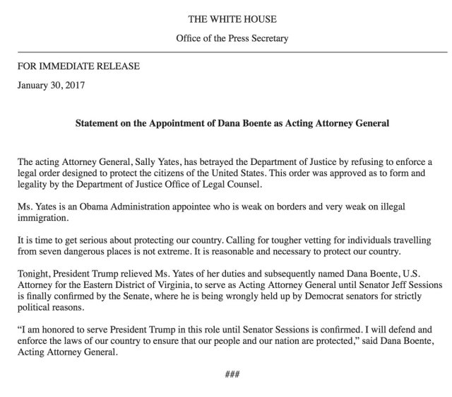 It's interesting to note that the new acting AG that Trump picked wasn't the next person in line. It's customary to follow the succession line. Boente is like the third one after Yates in the order of succession.