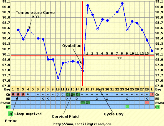 The chart below shows how fertility charting can show you how to identify your fertile days and your ovulation date.