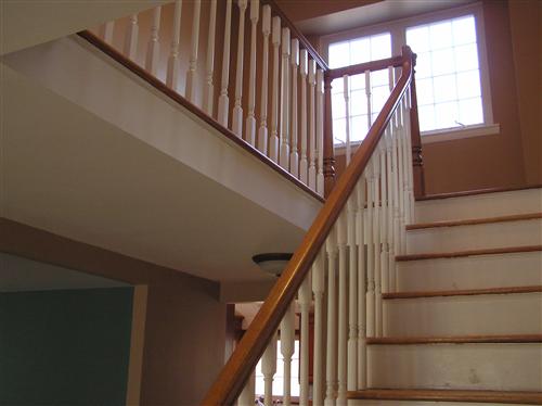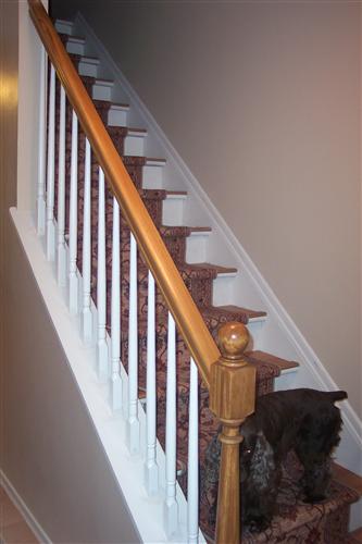 We had ours done. It's a long flight and wraps around the landing upstairs. These are pics taken right after the job was done and before we moved in.