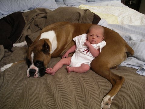 My parents had a boxer when I was a baby - I have almost the same pic with ME in it! Does Bama guard his bassinet/crib too?