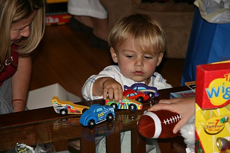 Love the pics !!! John has the sam PJ's. Are those wooden cars?