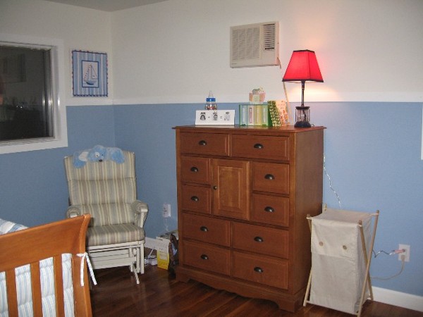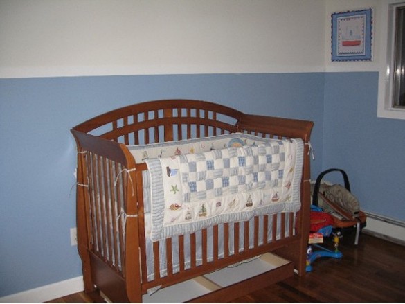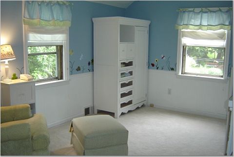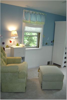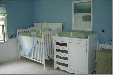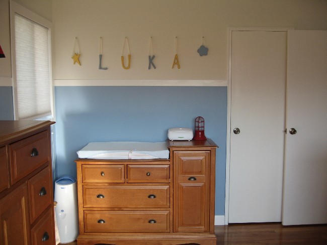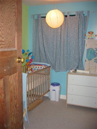 Blue Blue...my nursery is blue (and lime green) note how teensy tiny his room is, its called "a box room"
