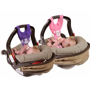 they have Podee bottles for multiples, safer for possible choking because they act like a pacifer and you can spit them out. They also work on a straw so good for gas, they are discounted and BPA free at bohemia TOYSRUS. I have stuffed animal bottle holders that I sold, I only have one left-if I can get more I will post it. They are extremely cheap, very soft and not bulky. The only downfall with the podee bottle is you have to have a good suck, a tiny baby or preemie might have a hard time. I did not use these with the twins, I used it for the car with my first two. If they wanted a bottle I knew they were safe with these in the back.