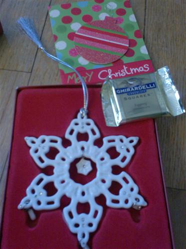 I got my ornament today . My buddy went above and beyond, the first ornament she sent never got to me, so she had one resent. I appreciate it more then you know. She also sent along a yummy piece of candy and a cute card. Heres a pic. I just hung my ornament right on the front of my tree. THANK YOU. Now tell me who you are. LOL. Image Attachment(s):