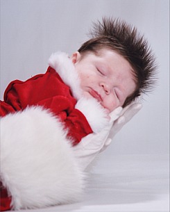 I did my son his first year with a Santa hat holding a candy cane. It was so cute! I also had a pic of him in reindeer ears with red lipstick on his nose. Another shot was him naked except for a well placed big red bow. He was only 2 months at the time so he was putty in my hands. The following year he didnt want to pose at all so I ended up strapping him in his highchair with a christmas print blanket behind him.