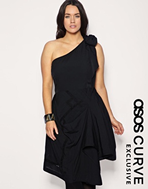 I want to find a dress that is knee length...a little shorter is ok..black, one sleeve (prefer flared) not too tight on the bottom and a material that won't cling too much. I am a 14/16 with boobs. To go with this, I was thinking of black platform pumps (not crazy high since I have to stand a lot). Any other suggestions are welcome.