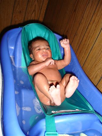 Awww he is so cute. I gave DD hers the other day. I got a tip that if you swaddle them in an old blanket and wash their hair first then unswaddle them for the bath that they stay quieter. I tried it and DD does really well in fact she closes her eyes and gets this relaxed happy look on her face.