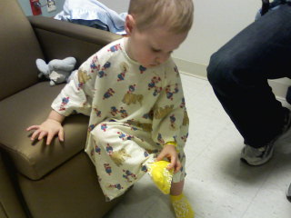 Here are some pictures of DS decked out in his hospital gown and bright yellow socks
