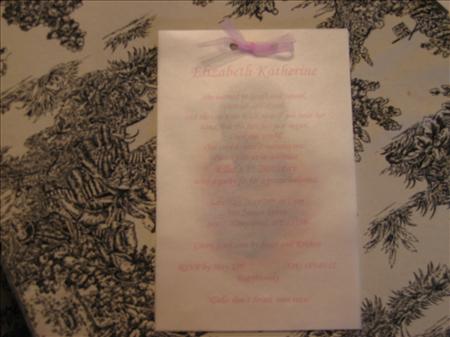 ok so I think I've got a prototype of what I want. I may tweak it some but I put together a sample last night. What do ya think? Please be kind they're homemade so there aren't alot of changes I can make to the format. I don't know how to use photoshop and things like that so I had to go a different route than everyone else has with the invites and I should give credit where credit is due I borrowed the idea from MelTodd's invite for Julia's 1st bday. Image Attachment(s):