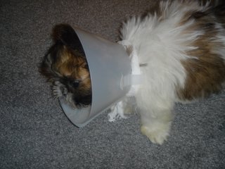 lol, OMG! I'm so not laughing at poor little tyson but this is soo typical to happen to you..lol Does Rob think he has an ear and eye infection now? Poor little guy... I honestly can't handle seeing that cone around his head...