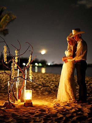 At sunset, as Otis Redding's "I've Been Loving You Too Long" played from their private cabana, Jewel, 34, (in Monique Lhuillier) met her groom (in jeans and cowboy boots) in the sand to recite their handwritten vows. "I said that I'll try to make our lives the best piece of art I've ever done," she said.
