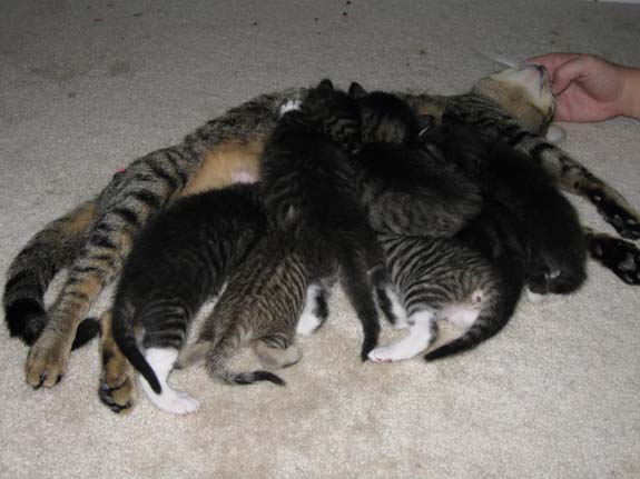 We're definitely keeping Delilah (the mama cat), but we also have another cat. As much as I would love to keep one of the kittens, that would put us up to 3 cats, which is certainly a lot We'll see how many takers we have for the kittens in about 5-6 weeks...it'll break my heart to give them away, though