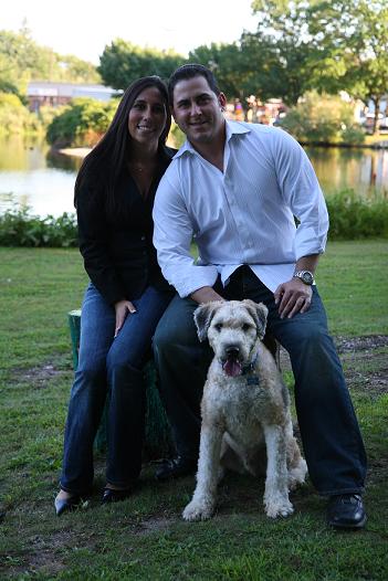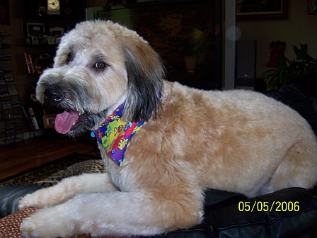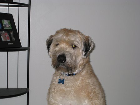 BARKLEY -He looks like the dog on seasame street -Soft Coated Wheaton Terrier -4 -Barkley is our little man.. The center of our world. he is the best! -Very protective of his mommy (me) when on the leash or in the car. :) so mean ppl watch yo step! lol