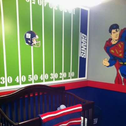 thansk everyone. My aunt and uncle just got us the toy chest. I think they bought it online. My DH did the room and did such a great job. Our friend painted the superman. I dont know if u can tell but the S in his chest is really an NY. and he also helped us out with the trolley over the window.. I love it! Just have to accessorize now!