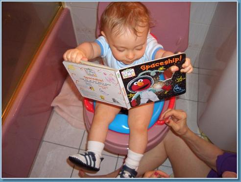 He looks comfy on there. Nothing like an Elmo potty and Elmo book to keep you busy!