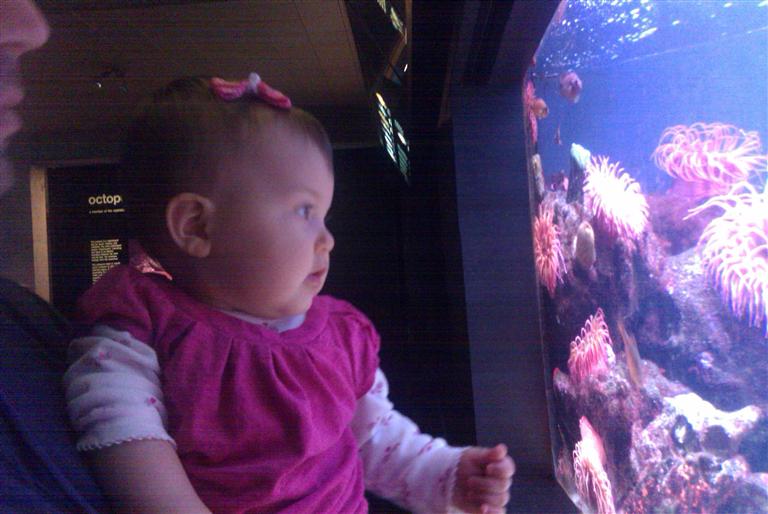 We left our Nikon D60 at baggage claim (we think) at Logan airport. We were SO bummed, called all weekend to see if anyone turned it in and no luck. It had Sienna's 9 month picture on it and some other recent pics too... I just wish someone would have done the right thing and turned it in. So we had no camera, my sister took a bunch of pics with hers... but for now I posted one below from my phone at the new england aquarium.