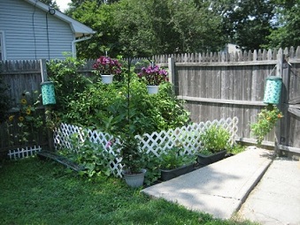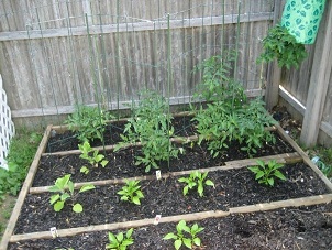 We had our first raised vegetable garden this past summer, and it worked out great. DH actually just used a part of the wooden framework from a deck around our pool that was torn down. He built the small fence around it as well, and we had no problems with bunnies or any other critters getting into the garden. The first picture is when we first started the garden, and you can see what the raised bed looks like. The second picture shows what our garden looked like by the end of the summer. We grew tomatoes, peppers, eggplants, and cucumbers with full sun on the garden for most of the day.