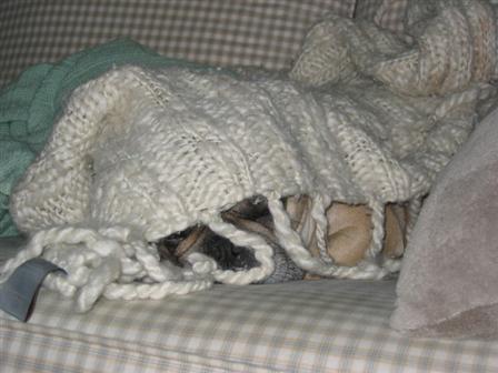 I've been on the computer for the last hour and all has been quite quiet in the house, so I ask myself "Where's Peanut"? I checked all over... he's no where to be found! Until I look on the couch to find him UNDER THE BLANKET SLEEPING!!!! I swear to you I did not position him like this... he did it all by himself!!