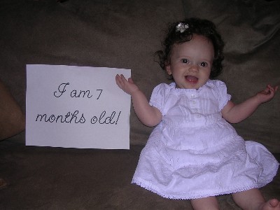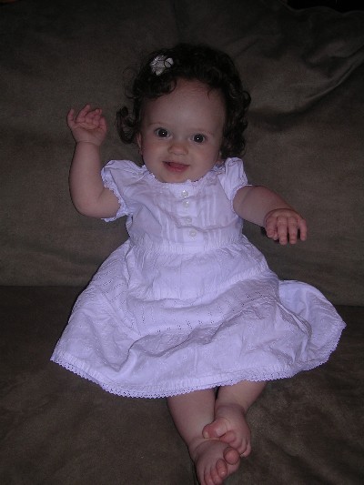 Holy Cow when did that happen??? I feel like you just posted her 6 month pics like a week ago!!! Tim is a flyin'! She is a sweetie! Lovin' her dress!!!!!