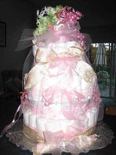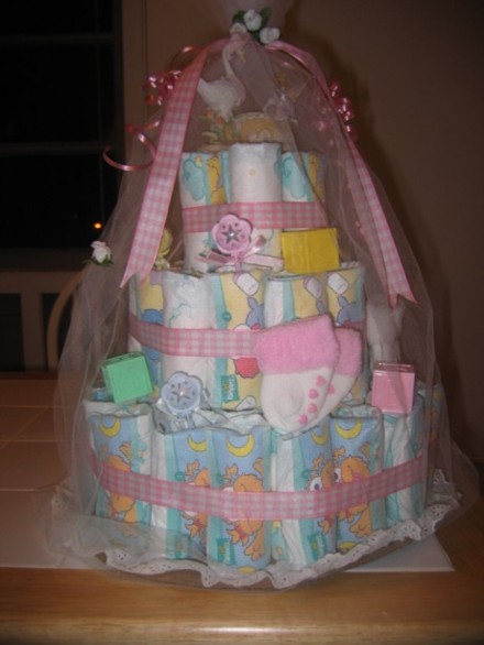 My mother made me a diaper cake for my shower and it was all pampers with ribbon tied around each layer and a cute pooh bear candle on top-it was adorable!
