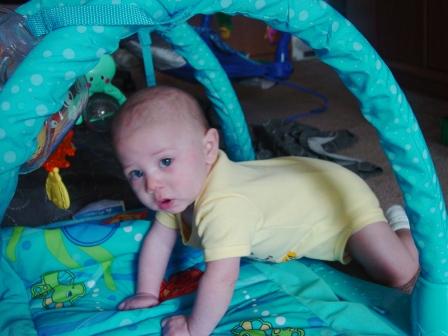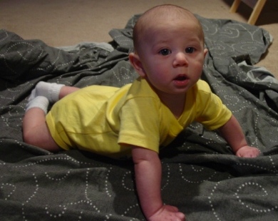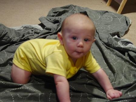 Christopher isn't even 5 months yet and he's DESPERATELY trying to crawl. He can get up onto his knees and he just kind of rocks back and forth. He doesn't know where to go from there. Here he is this morning: Image Attachment(s):