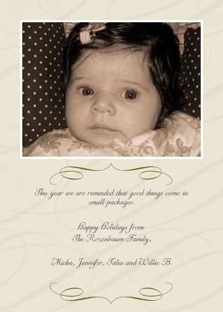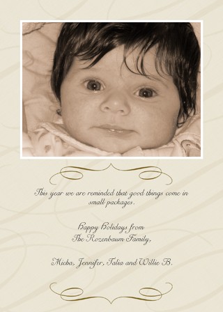 How about, "The best gifts come in small packages"...this is what our cards are going to say...that is when I finally motivate myself to do them. Although, I love what you wrote too. As for the picture....I can't decide I love them both......Talia is so beautiful....any pic you chose will be fine....but I do love the little clip in her hair in the 2nd pic....I'm nutty...I know.....I just love hair accessories for little girls....Ava literally has about 40 something hair thingies and now all her hair is falling out.