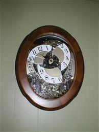 but the fac of the clock (1-12) swings around and open when it chimes and you see littel bells going around in a circle and there are trumpeters on the bottom swing around with swavroski (sp) crystals