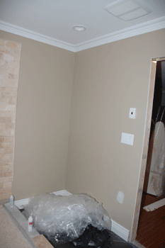 Here's our bathroom in progress. The mirror didnt come in yet, we still need to order the frame less shower door and the counter tops. The wood floor is actually tile and the grout we need to stain because it came out to light. In the corner where all the bags are I have a free standing piece that matches the vanity. The bathroom's overall size is 8x9. Image Attachment(s):