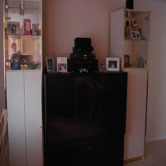 Every picture I have is too dark so I took these this morning. All 3 pieces have glass shelves and mirrored backs and lighting. The middle piece was removed (still in my living room) from the set to make room for our new TV Image Attachment(s):