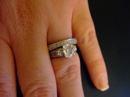 My wedding band was my grandmother's. She died 10 months before my wedding nad my mom told me thought that my Maw's ring would match my e ring. So, DH bought the center ring (my e ring) and it fit perfectly in my grandmother's 60 year old band
