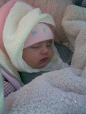 She got her shots today too. She is up to 9lbs 14 oz and 23 1/8 inces long. We love her sooo much. She has been very tough the past few weeks. She has her days and nights confused and nothing we do to straighten that out has worked. She has reflux, which keeps her up at night. She no longer sleeps in her crib, even with an incline it hurts her, so she sleeps in her swing. We started her on rice cereal in her bottle to try and help with the reflux. We are on our fifth formula now (knock on wood) that seems to be working well. She has bad gas, which we are giving her mylecon at every feeding. And she is just now finally going poopies on her own. When she was on the soy formula, it was binding her up and she needed me to push her legs back to go. Finally, with the new milk-based formula she is regulating again.