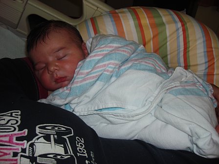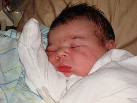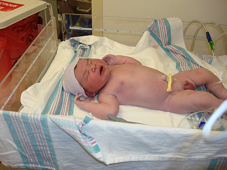 They brought my DH in and he sat by my head. The Anestiesioligist was so great and talked to me the entire time. I would make him give me percentages of how much was left in the surgery. They got Jack out in about the first 10 minutes - they said I would feel pressure (which I did) but it was the most amazing thing when I felt him out of my body and heard him cry for the first time. So amazing. The first thing Dr. Dolisi says was "WOW - this kid is SOLID" -- They bring him over to clean him up and they tell me that he is 9lbs 14ozs. I could not believe it! He was a litle monster. Dr. Dolisi said that I prob. never would have been able to deliver him vaginally so that I made a good call with the section.