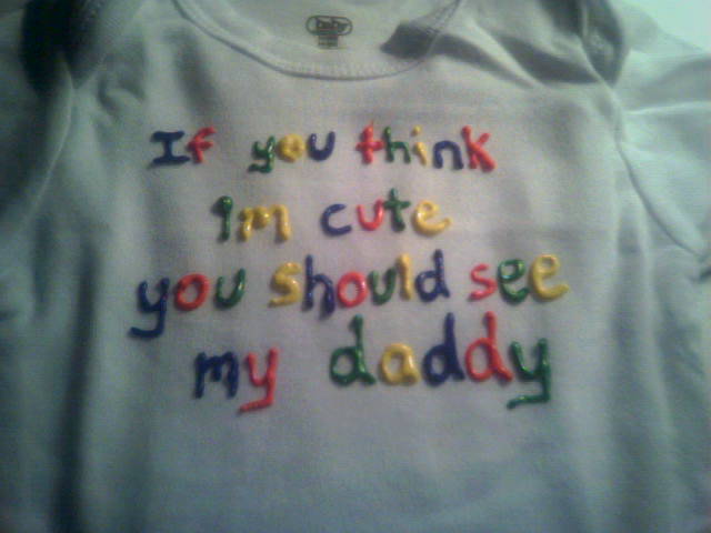 Well, I searched long and hard over the past 2 weeks for anything that had this saying. It was suggested I make it myself. So I did it!!! Now we have a one of a kind onesie! Image Attachment(s):