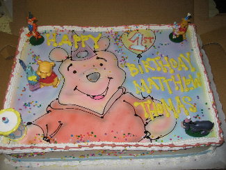 That's an awesome idea. I would have to ask the bakery. They did an awesome winnie the pooh design last year for DS's 1st birthday. I brought in a picture well actually a napkin with the winnie the pooh design and then created it on the cake...this was the picture on the napkin and this is how they did the cake...I loved it..