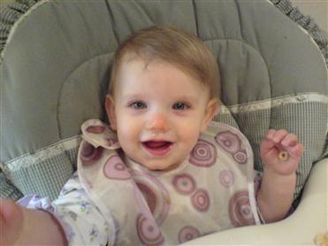 She's munching on a pickle. She friggin' LOVES pickles (like her mommy). No teeth yet so she just gums it.