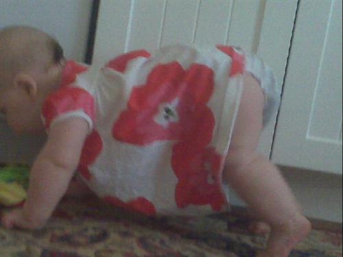 My DD turned 6 months on the 7th. She goes to the dr this coming Monday, but I suspect she's over 19 lbs (she was 18.2 at her last visit) and at least 27 inches. She's a big girl! She started sitting up last week. She'd been rocking on her all fours and getting around by squirming, pivoting and rolling, but as of yesterday she started crawling! She's also trying to stand up. I'm amazed by how advanced she is, but at the same time I'd like her to slow down and stay my little baby a little while longer. We have to get baby-proofing!