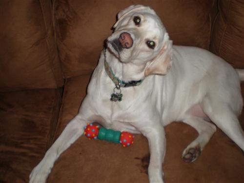 Thank you to Layla's Secret Santa. I wish I knew who sent her such nice gifts so we can properly thank you! She got a rubber squeeky toy which she LOVES! Plus kong stuffin' treats, another hit! And, a aqua kong for the summer! Thank you so much!!!!!! I will now attempt to post a photo: