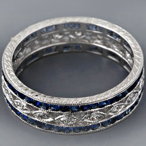 Well, I always wished I had gotten a sapphire engagement ring, so I was thinking of getting a ring like the first one to wear as a wedding band. As much as I love my e-ring and wedding band, I love to have different things to wear. My mother has always had a ton of different wedding bands, and I guess it's rubbing off on me Now, let's hope and pray JT will buy it for me!