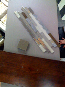 ETA: I forgot I took a picture of the floor, cabinet draw front and accent mosaic (we are running it on the bottom of the backslash). The field tile is a natural stone 2x4 subway in between the floor and counter (the small square) color. Image Attachment(s):