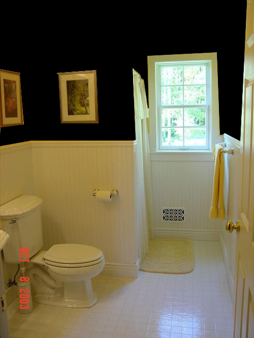 the pics posted are not my bath. this would be for a small powder room. i am somewhat apprehensive but think that it would really make a dramtic impact. creamy white beadboard or wainscoting, molding and ceiling, flat black on upper walls, ceiling mediallion, chandelier, white pedestal sink and white toilet. would accent in red or change w/ the seasons.