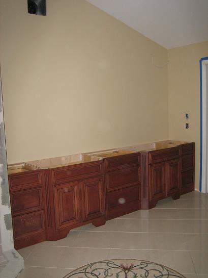 The base cabinets were just installed in our master bath...the long unit (10 feet) is where the sinks will go; and the vanity on the other side (5 feet) will be a make up table.
