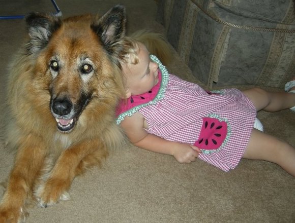 We don't have a dog but I grew up with dogs. My mom said they used to sleep under our cribs to "protect" us I just love that about dogs and kids.