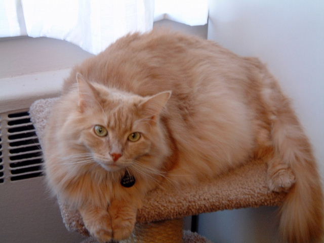 He is the baby of a female cat we had that got outside and got PG by a stray MAine Coon. She had 3 kittens in the litter, one died, and one was born deformed and died. Only Terror survived. After about 2 weeks, she decided she didnt want him anymore I guess. She carried him into the living room, jumped on the couch where we were sitting and just left him there, she never would go near him again. My mom at the time had to feed him with a baby bottle for kittens and he lived on the couch till he got big enough to crawl down, it was so cute. Well I think he thinks hes human now ( he holds entire conversations in kitty talk when we get home at night) ..