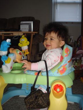 she's a girl on the move, in her walker with her purse, all set to go!!