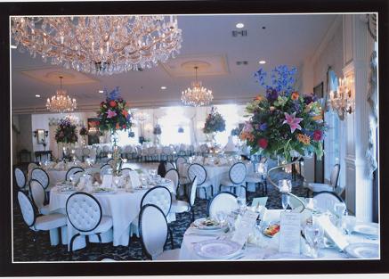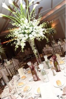 A little hard to see, but we used chocolate brown runners (which I had made with a seamstress) and ivory linens. Centerpieces were square vases with blue hydrangea, white callas, and white roses/ranunculus.