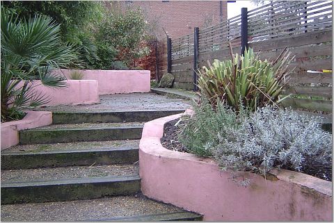 The walls are actually stucco/rendering over brick and it used to be painted royal blue!!! the last owner painted them pink in an attempt to go for a "Mediterranean feel" We're going to take out the smaller parts, but again have the issue of having to drag all of the concrete and earth through the house, so some of it will be "transformed" into seating and all of the concrete will be decked over.
