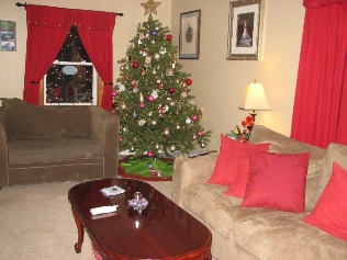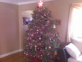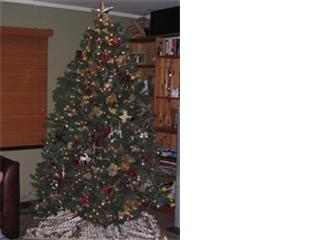 Here's our tree this year. We usually have a red and gold theme on the tree. We have some filler ornaments and have made it a tradition to buy each other one ornament a year to start buildling up some special ones
