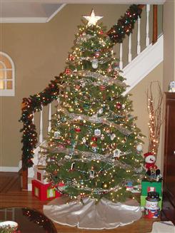 I'm doing my tree today but I'll post all of the pics I have on this computer from past years. I have done the verticle ribbon forever, I have short pieces of floral wire tied around the ends of the ribbon & I wrap it aroung the top branches of the tree. Then I use big bows. old house