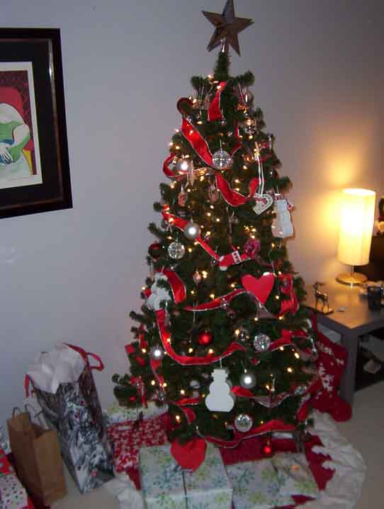 our apartment is black / grey/ white with touches of fire engine red, so it's only fitting that our tree be red / white / silver to match everything else...